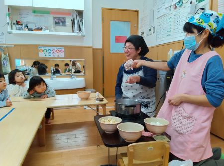 子ども達も、まだかまだかと見守っています。煮えたかな?まだかな…?