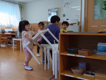 食事はペアで集まり、毎日好きな場所を選んで食べています。自分で机を運んでセッティングしていきます。