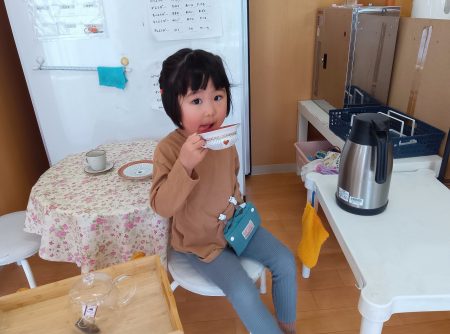 ゆりグループでは、年少の頃からずっとあこがれていたお茶を入れるおしごと、野菜を切るおしごとなどが人気です。お友だちを誘って一緒にお茶を飲んだり、切ったお野菜をお誘いして一緒に食べたりしています。