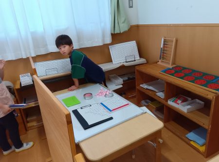また言語の分野も去年から引き続き多くの園児が取り組んでいますが、4月になってどっと数の分野のおしごとを「やりたい」と意欲的に取り組む姿が増えてきました。