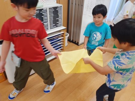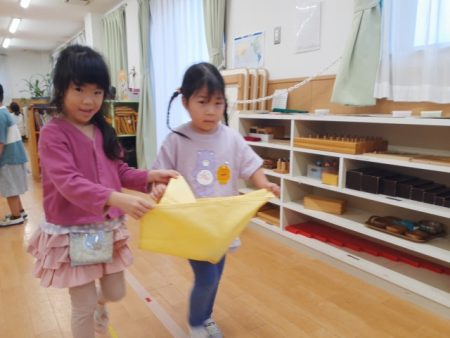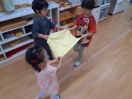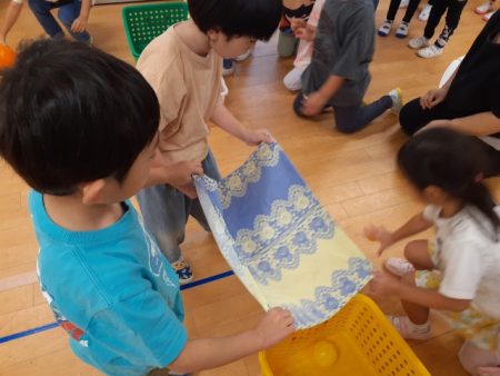 籠の中にある大小さまざまなボールを布に載せて運ぶという競技なのですが、「このボールが良い!」「ぼくはこれがいい」などと三人でどのボールにするか話し合ったり、「こうやって乗せるんだよ」「こっち持って!」などとボールの乗せ方を協力して考えながら楽しむ姿があります。