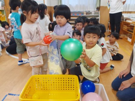 もともと異年齢間で一緒に遊ぶ場面が良く見られていた様子や異年齢児での交流をより深めてほしいという思いから、今年は3・4・5歳児の三人組で協力して行う「ボール運び」を運動会で行います!