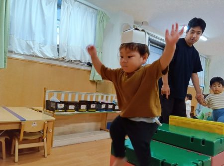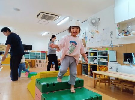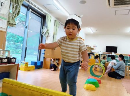 そっと後ろを向いて巧技台から降りたり、しゃがんでから降りたり、保育士の手を借りて降りたり、ジャンプして降りたりとそれぞれ全身を動かしながら上手に降りていますよ♪