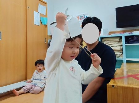 最近では身のまわりのことを「自分でやりたい!」という気持ちが見られるようになってきた子どもたちは上手に自ら帽子を被ってサーキットに向かっています!
