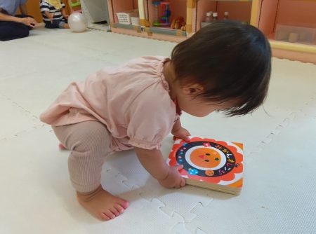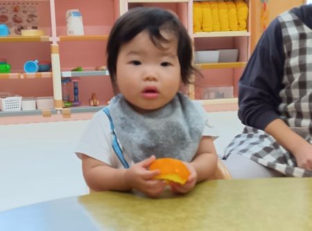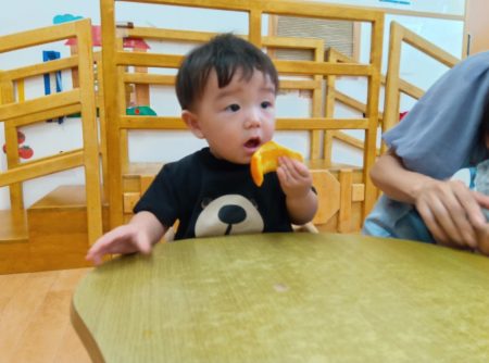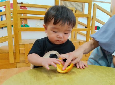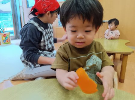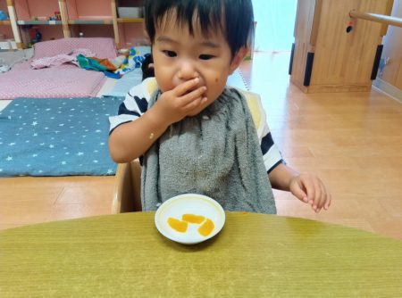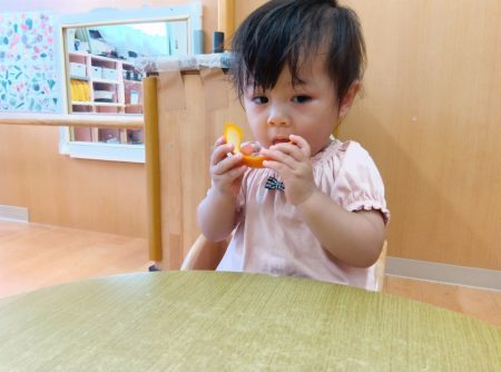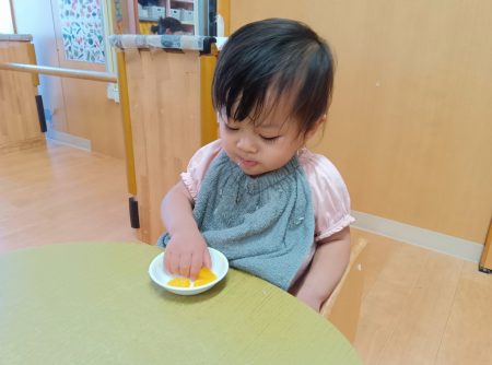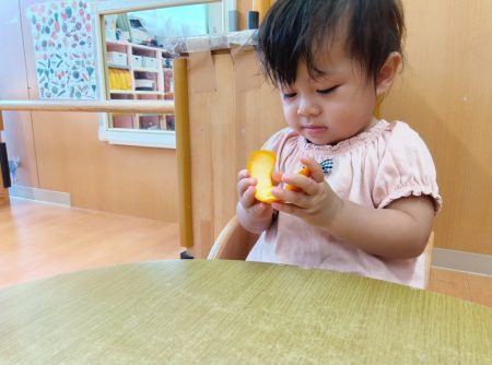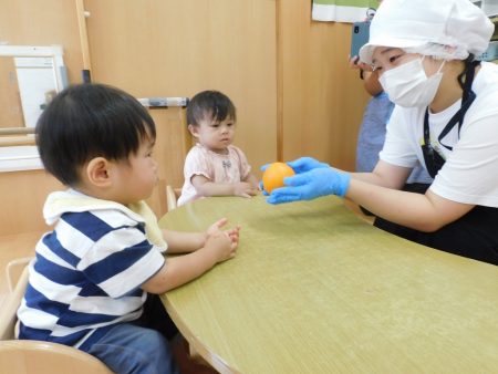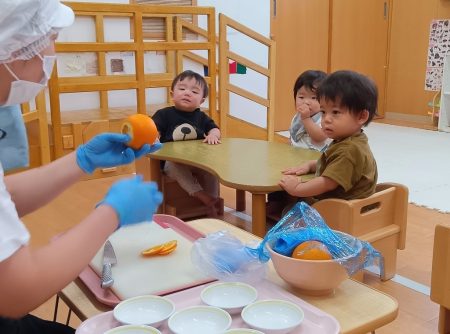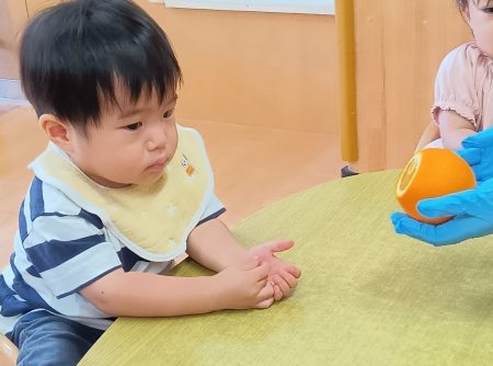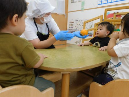 今回はこの間行われたクッキングで子どもたちが実際のオレンジを見たり触れたり、匂いを嗅いだりしている様子を伝えをします。