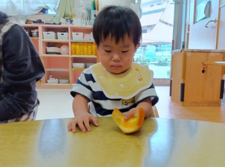 実際のオレンジを見ると、いつも給食では見たことのない形をしていて驚きを見せていました。