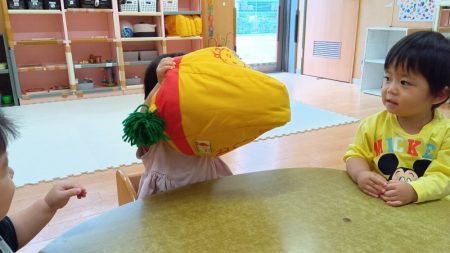 中には保育士の真似をして実際に被ろうとする姿も!
