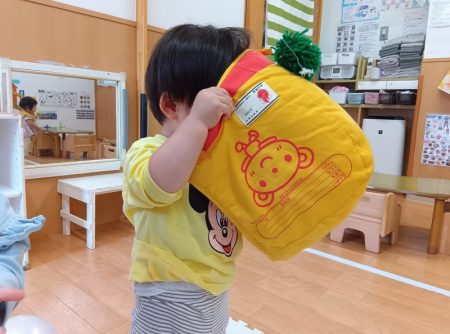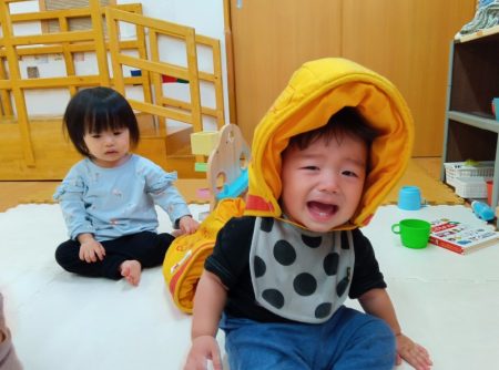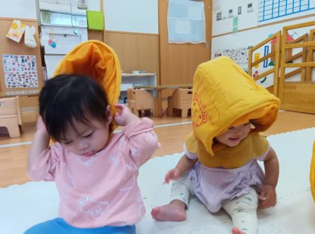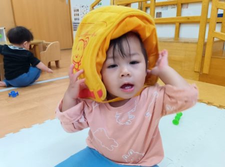 防災頭巾を被ってみたよ!~アイン三枚町保育園 わかば組(0歳児)~