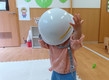職員用のヘルメットも実際に見せたら、気に入ったようで被ろうとする子どもの姿も見られました。