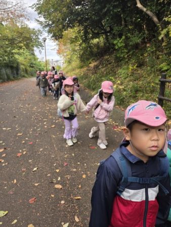 歩いている途中に、真っ赤な紅葉を見つけると「真っ赤だな~ 真っ赤だな~ つたーの葉っぱは真っ赤だな~ もみじの葉っぱも真っ赤だな~ ♪」と今月の歌を口ずさみながら歩いていました。