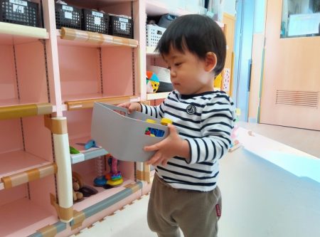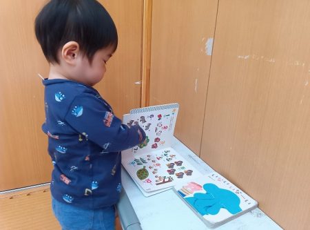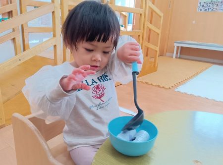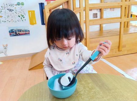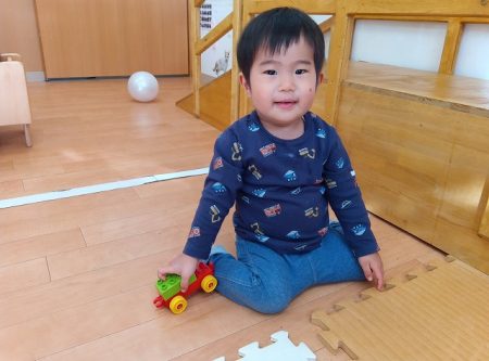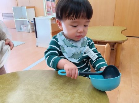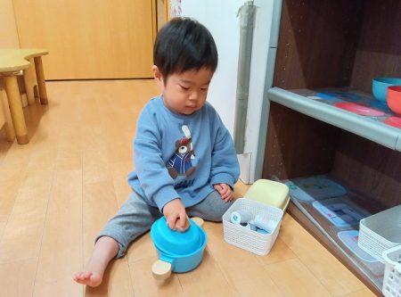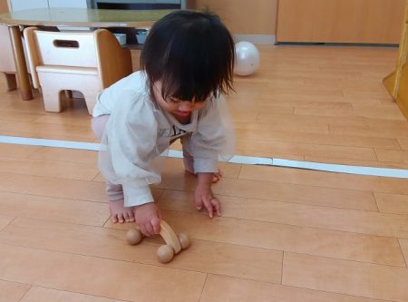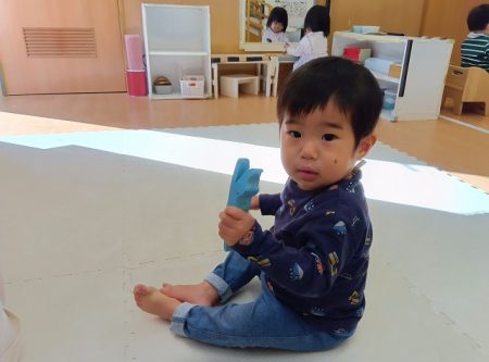 模倣遊びが段々と上手になってきて保育士の真似をしながら遊ぶことを楽しんでいます。