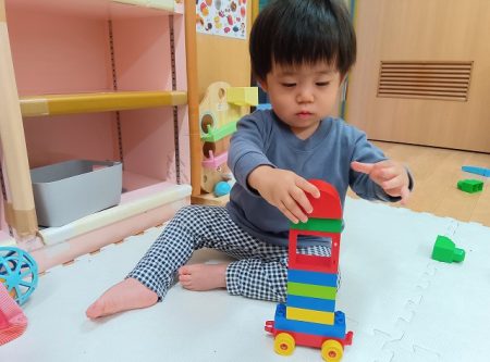 子どもたちもブロックが組み立てられるようになり、高く積み上げたり、車の玩具を使って乗り物を作って走らせる姿が見られています。