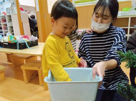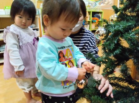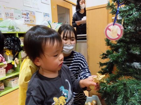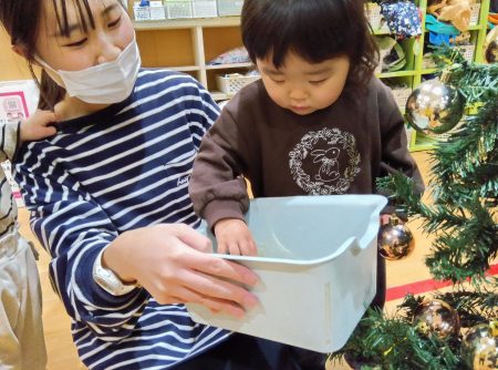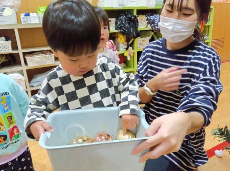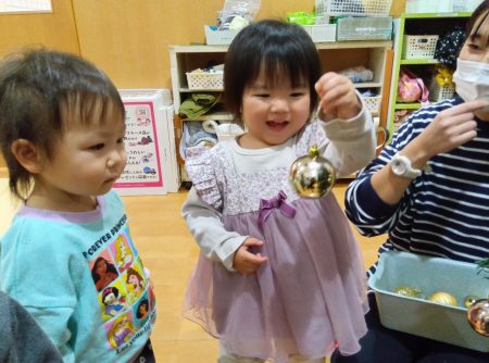 カゴから飾りを出す際に好きなものを選び、嬉しそうに眺めたり、「きらきら~」と綺麗な飾りを楽しんだりする姿もみられましたよ。
