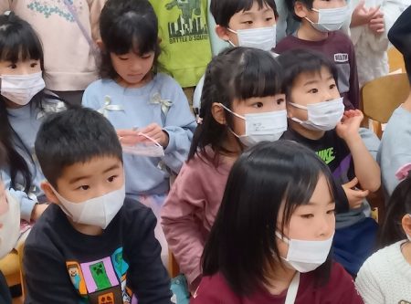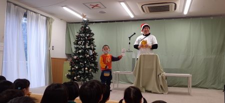 続いて保育士によるマジックショー。結ばれた2枚のハンカチが、今日誕生日の子が息を吹きかけるとほどけたり、皆の「メリーメリー、クリスマス!」という元気な掛け声で選んだカードが飛び出してきたりすると驚いた表情を見せていました。