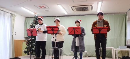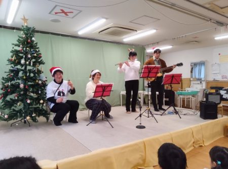 お次は職員による演奏会。ハンドベルやギター、フルート、打楽器などでクリスマスソングの演奏をしました。体でリズムを取りながら聴き入っている姿がとても印象的でした。