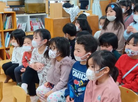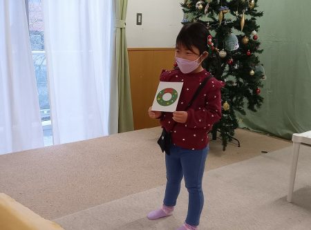 そして待ちに待ったクリスマス当日。クリスマス集会が行われました。集会では、”どうしてクリスマスツリーを飾るのか”という内容の紙芝居を読みました。どの子もじっと耳を傾け、集会後には紙芝居から学んだ知識を保育者に教えてくれる姿も見られました。