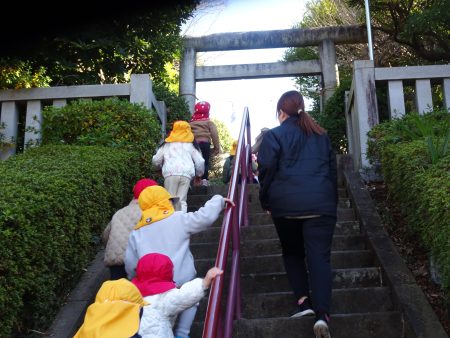 みんなで神社の階段を上がってよいしょ、よいしょ。