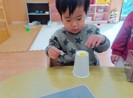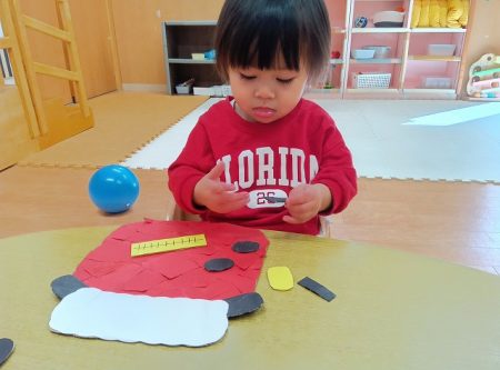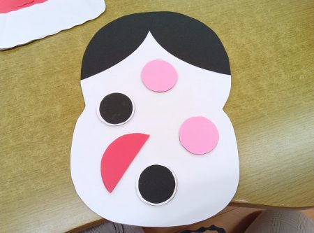 わかば組では今週、お正月遊びを体験する期間として福笑いやお手玉、コマ、だるま落としなど、沢山の伝統的な遊びに触れてきました!