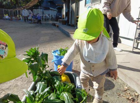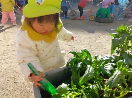 子どもたちも園庭に出ると水をあげていたほうれん草!
