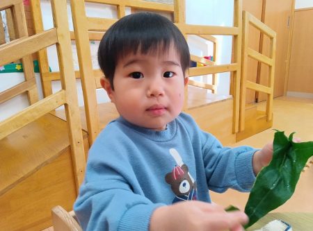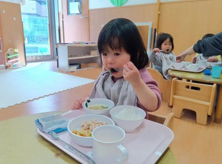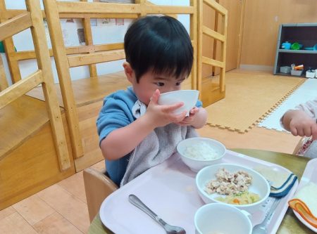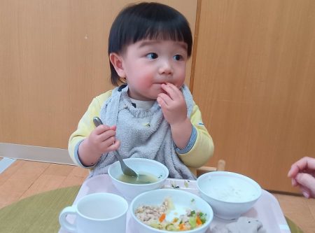 子どもたちも「ぱぁ~」と言いながら調理の先生の真似をしてちぎることを楽しんでいます。