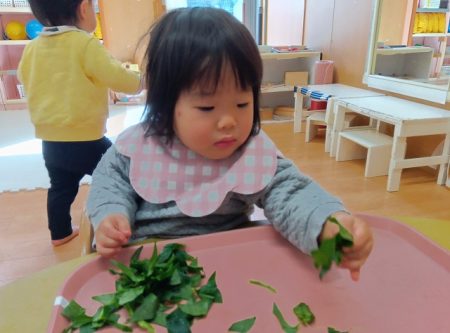 クッキング活動では、調理の先生の話しを聞いた後、味噌汁に入れるほうれん草の葉をみんなでちぎりました。