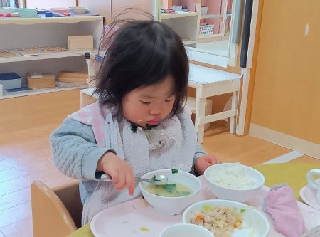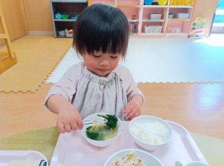 ちぎったほうれん草は調理の先生が味噌汁に入れてくれ、みんなで美味しく食べました。