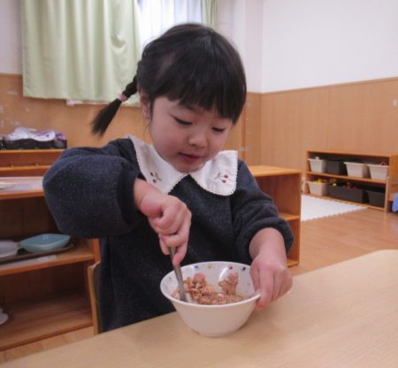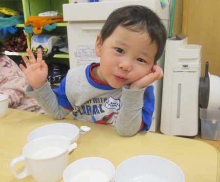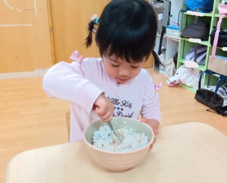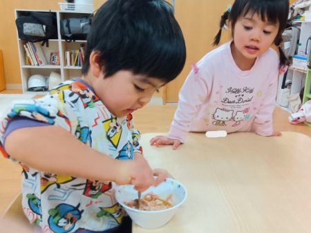 次はこれらの材料を混ぜていきます。「1・2・3...はい!つぎ○○くんね!」と数を数えながら順番に混ぜる姿がありました。