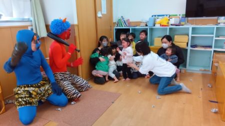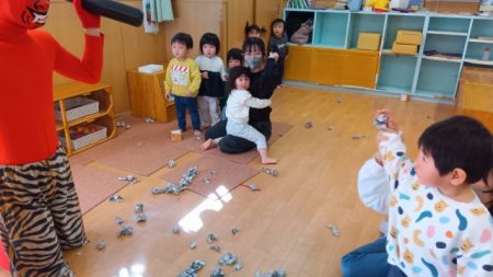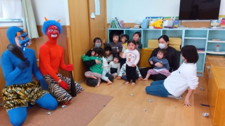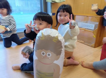 「おにさん、こわい」と話したり、鬼のパンツの替え歌を歌う姿もあるなど、子どもたちは鬼がやって来ることを様々な表現で楽しみにしている様子でした!