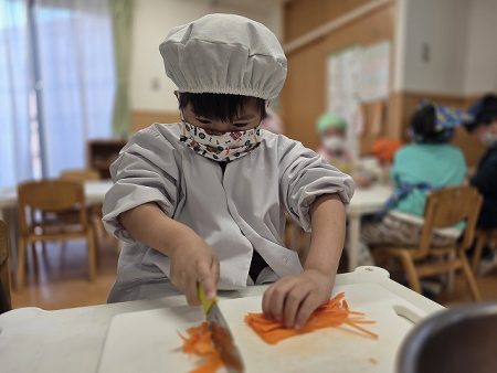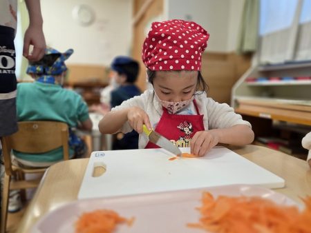 お昼寝明けにはさくらグループとゆりグループで具材作り!人参を包丁で切ってもらったり、お肉を炒めてもらったり、ご飯に御酢や砂糖を混ぜてすし飯を作ってもらいました。