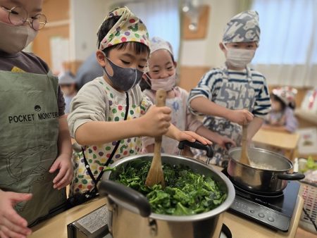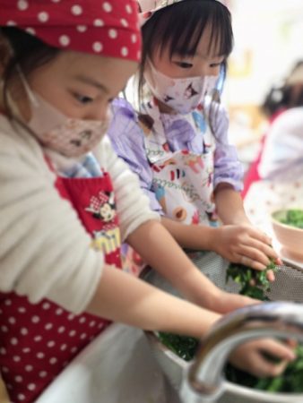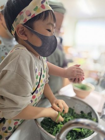 小松菜を絞ってもらうと「すごい力を使うね・・・」「まだまだ水がでてくるよ・・・」と手が震えるほど、力を込めて絞ってくれました。