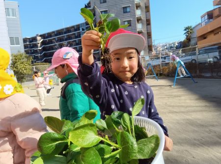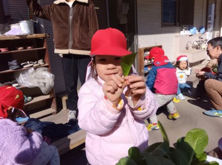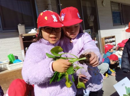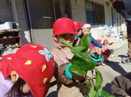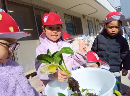 朝ちゅーりっぷグループの子どもたちに、保育園で育てている小松菜を収穫してもらい、せっせとちぎってもらいました。