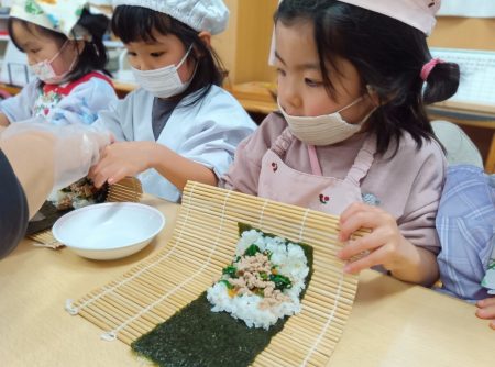 海苔にご飯をしいて具材を乗せ、巻きすで巻くと「難しいね」と言いながらも上手に巻いていました。