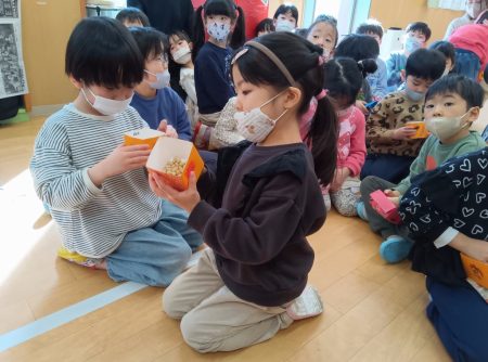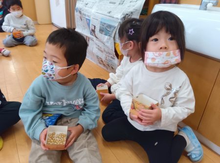 いよいよ手元に豆が配られると、子ども達にも緊張が走り始めました。周囲をキョロキョロしながら、どこから鬼が入ってくるかみてました。