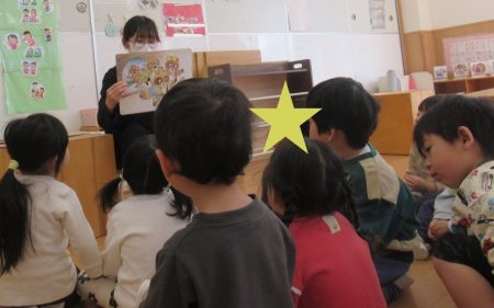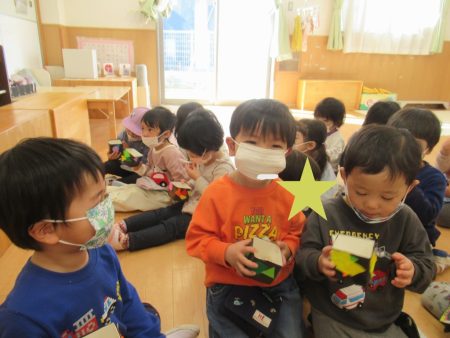 節分の紙芝居を読んで、升のことを知った子どもたち。「おまめいーっぱいもって、おにをやっつけないとね!」とやる気満々になっていました。