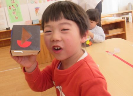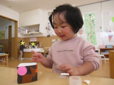 そして真っ黒な升にいろいろな色や形の折り紙を貼って、オリジナルの升を作りました。