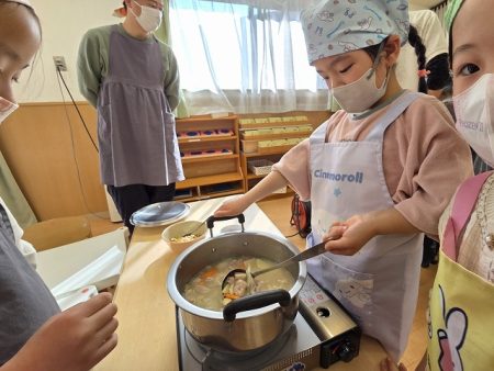 あくについてお母さんたちに教えてもらいながら、上手にすくう子もいれば、スープと一緒にたくさんすくってしまう子も。なかなか難しい作業でしたが、がんばって取ってくれました(笑)