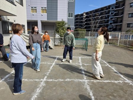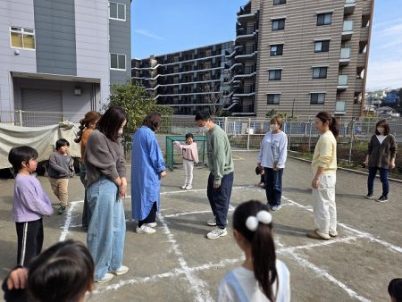最近、子どもたちが良く遊んでいる『9マス鬼』を保護者の方も一緒に行いました!