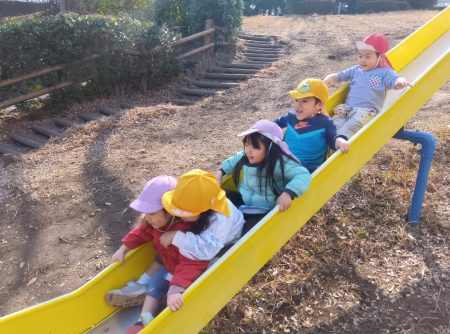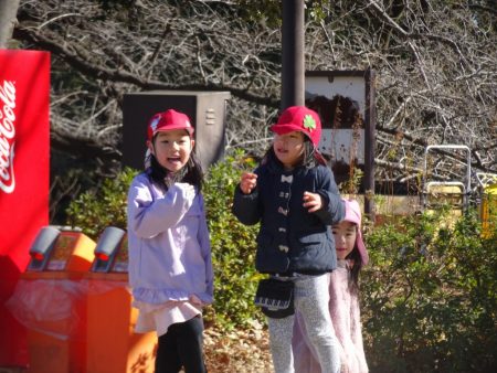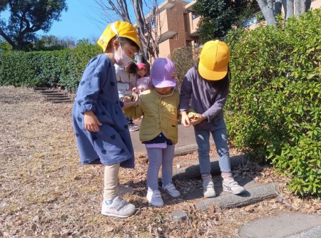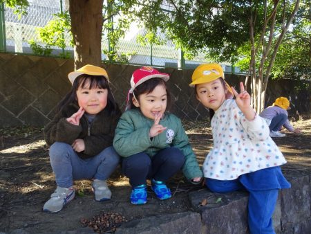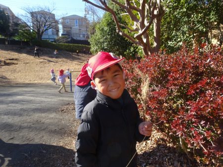 同じクラスのお友だちや異年齢のお友だちと丘をぐるっとかけっこしたり、どんぐりや垣根の落ち葉を拾ったりと冬の季節を感じながら思いきり身体を動かして楽しんでいます。