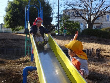 公園すみれ組の園児が来年はな組に上がってきても仲良しのお兄さんお姉さんがいると安心した見通しを持てるように、週に一度一緒に公園に行って遊ぶ機会を設けています。