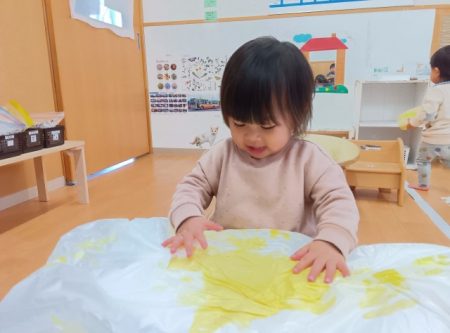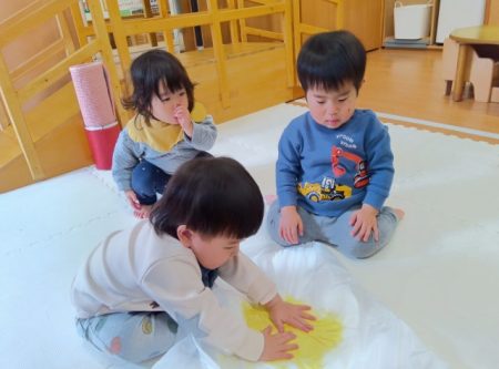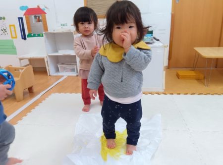 製作では、ビニール袋に画用紙と絵の具を入れ、足で踏んだり手で触って感触を確かめながら色を付けてもらいました。