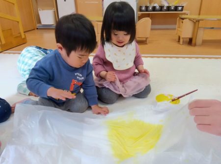 まずは白の絵の具に黄色の着色料を入れ、子どもたちと一緒に混ぜながら色を混ぜる体験をしました。
