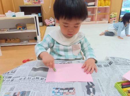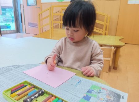 クラスでも子どもたちにクレヨンとシール貼りを選んでもらい、ひなまつりの製作を行いました。