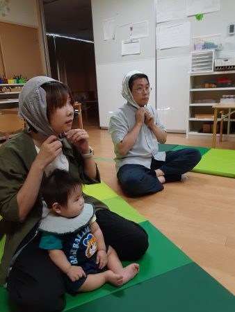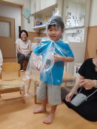 まずは、「家庭にあるもので出来ること」をコンセプトに、避難時の豆知識紹介やグッズ作りをしました。毛布で簡単に出来る担架で運んでみたり、大人1人で大人1人を運ぶ方法など、実践しながら学びました。ゴミ袋で作るレインコートは、切る位置を変えるだけで大きさを変えることができるので、親子でかぶり可愛い姿も見ることが出来ました。