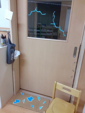 最後には、地震からの火災想定で実際に避難訓練を行いました。ガラスが割れいたり、煙が充満したりしていて通れないことを想定し避難ルートを選択しました。